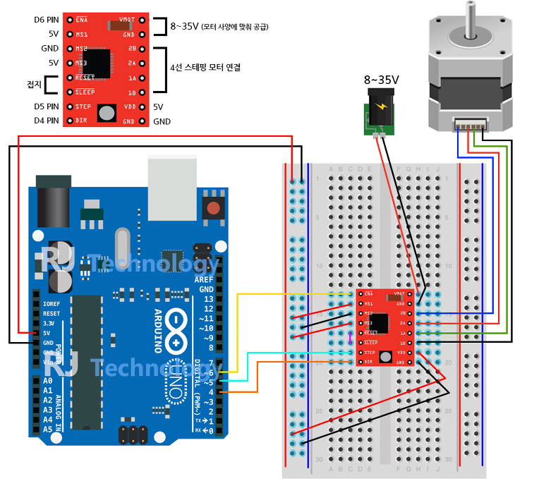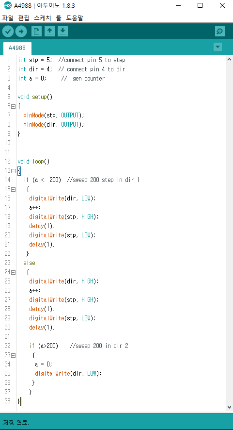 - STEP핀은 펄스를 일정하게 주입하면 되고, DIR의 ON 또는 OFF 신호에 따라 정방향 역방향으로